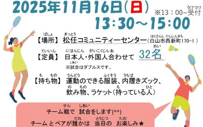 The Hakusan International Association (HIA) is a private international exchange association which conducts exchange projects between our 5 sister cities abroad, multicultural activities which further promote coexisting in harmony with international residents and also grassroots exchange events. In order to get more local residents involved, we are always on the look out for new potential members. Why don’t you join us and enjoy participating in our international events and activities!